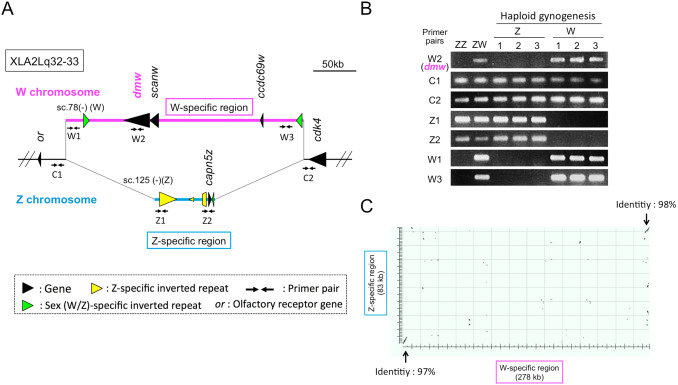 Fig. 1. Structures of sex-specific regions in the W and Z sex chromosomes. (A) Schematic representation of the W- and Z-specific loci on chromosome 2 L (XLA2L), which comprises the W and Z sex chromosomes. Magenta and cyan lines represent W- and Z-specific regions, respectively. Black triangles indicate genes and the tips correspond to their 3â² ends. dmw is a female SDG. The positions of the W-specific (W1, W2, and W3), Z-specific (Z1 and Z2), and W/Z-common (C1 and C2) primer pairs used in (B) are indicated under the chromosomes. sc., scaffold. The symbol (-) after sc. names means that the graphical representation corresponds to the reverse sequence drawn in direction 5â²â3â². The q-ends are to the right side of the chromosomes. (B) Genomic PCR analysis of the W/Z-specific and -common regions using the primer pairs (W1, W2, W3, Z1, Z2, C1, and C2 in (A)). PCR was performed using genomic DNA derived from one individual from the diploid ZZ or ZW J strain or three Z or W haploid individuals. (C) Dot plot comparison of the W- and Z-specific regions. |