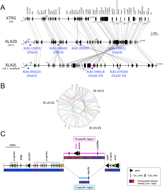 Fig. 2. A chromosomal inversion and transposable elements of the q-subtelomeric region that includes the W/Z-specific loci in chromosome 2L. (A) Synteny analysis of the q-subtelomeric region that includes the W-specific locus in chromosome 2L (XLA2L) and its corresponding regions in X. laevis chromosome 2S (XLA2S) and X. tropicalis chromosome 2 (XTR2). Synteny in XTR2, XLA2S, and XLA2L was investigated using X. tropicalis v9, the unprocessed X. laevis genome v9.1, and corrected X. laevis genome v9.1, respectively. Triangles indicate genes and the tips correspond to their 3â² ends. Olfactory receptor (or) gene clusters are indicated by squares. Magenta and blue lines represent the regions of the W-specific sequence and BAC clones used for FISH analysis, respectively. The q-ends are to the right side of the chromosomes. (B) A circos plot made based on (A). A red arrow indicates the W/Z-specific locus. c, centromere side; t, telomere side. (C) Transposable elements (TEs) in the W/Z-specific and their surrounding regions on the W and Z chromosomes (XLA2L) in X. laevis. The TE density was analyzed using the CENSOR program (http://www.girinst.org/censor/index.php). TpA_Harb and TpB_Harb were identified by BLAST analysis. Magenta and cyan lines represent W- and Z-specific regions, respectively. Triangles indicate genes and the tips correspond to their 3â² ends. |