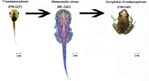 Transcriptome profiles of metamorphosis in the ornamented pygmy frog Microhyla fissipes clarify the functions of thyroid hormone receptors in metamorphosis.