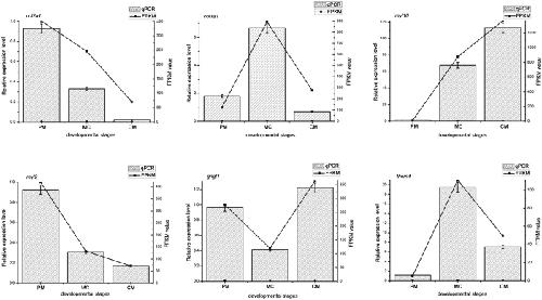 Figure 3. Expression profiles of six genes.The X axis represents the developmental stages. Lines represent the FPKM value of the transcriptome result (Y axis at right). Columns and bars represent the means and standard errors of three individual samples (Y axis at left). Each experiment was performed in triplicate.