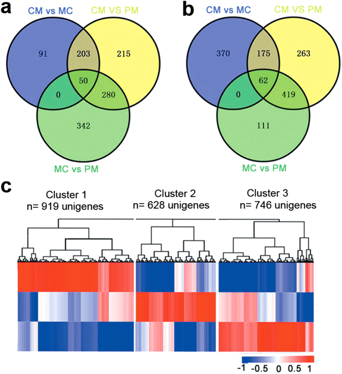 Figure 2. Analysis of differentially expressed unigenes during Microhyla fissipes metamorphosis.Venn diagrams show the number of genes significantly (a) up-regulated and (b) down-regulated; green, blue and yellow circles represent the changes from PM to MC, MC to CM, and PM to CM, respectively. (c) Similarity of the expression profiles between genes with hierarchical clustering is shown above the heatmap. Intensity of color indicates expression levels, and the three major clusters represent the PM, MC and CM stages.