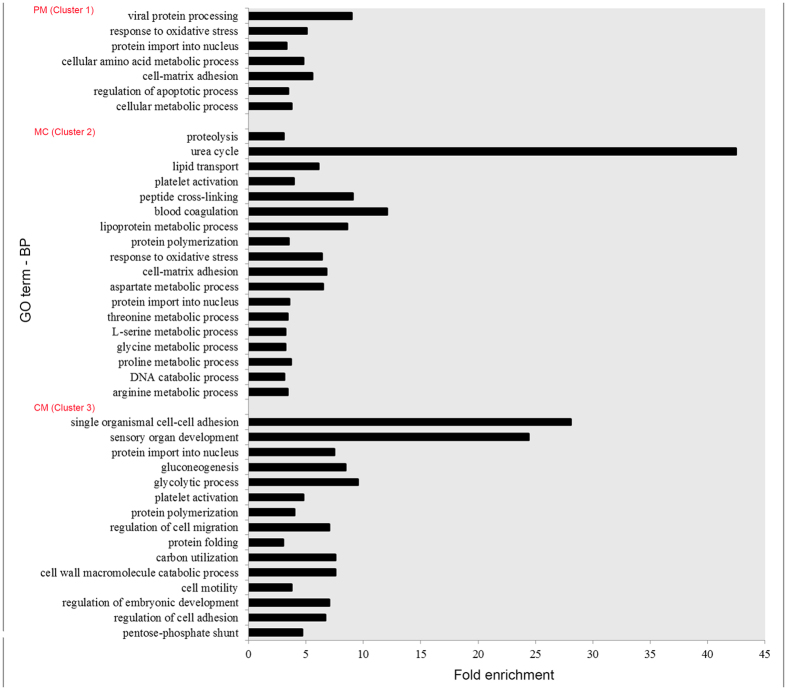 Figure 4. GO enriched processes in three key developmental stages.The significantly overrepresented (FDR < 0.05) enrichment factors of GO biological processes of the three clusters using hierarchical clustering are shown (Table S7). Only groups containing more than five genes and having a fold enrichment factor >3 are presented.