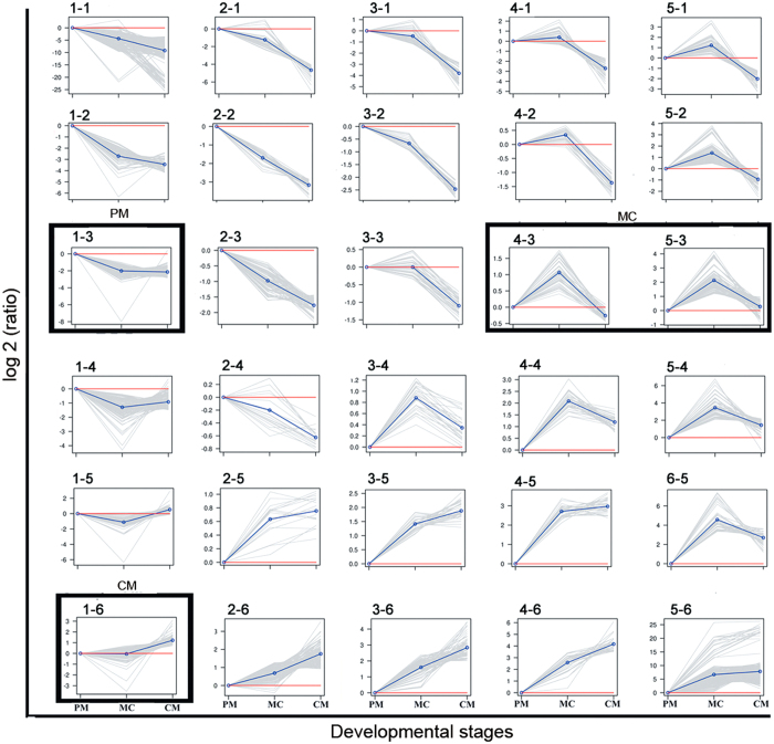 Figure 5. Clustering profiles.Plots of SOM profiles of the reduced set with their centroids highlighted in blue. Four clusters that were further analyzed for stage-specific expression patterns are marked in black boxes. The vertical axis represents the relative gene abundance, and the horizontal axis shows the three developmental stages.