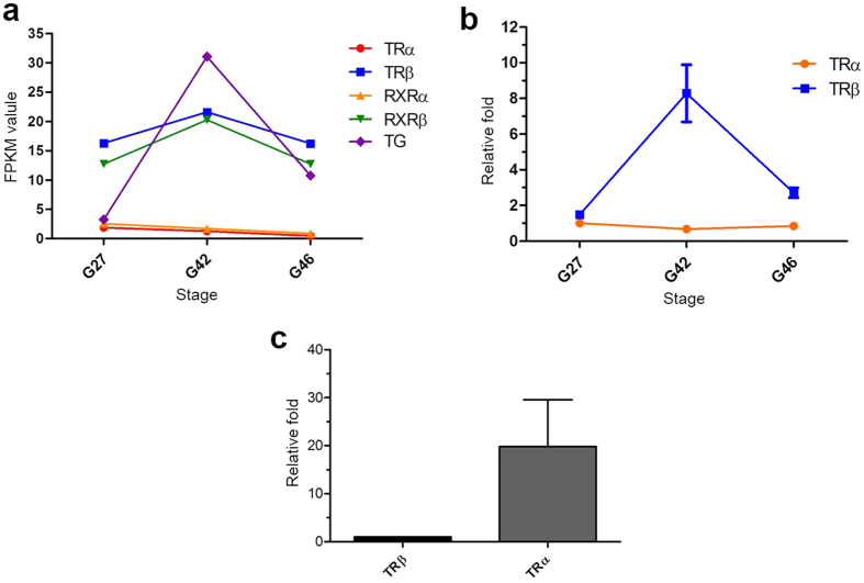 Figure 6. Expressional profiles of thyroid hormone (TH) - related genes involved in regulating metamorphosis.(a) Correlation of the expression levels of TRα, RXRα, TRβ, RXRβ and TG mRNAs with the three key developmental stages of M. fissipes. The vertical axis represents expression levels (FPKM value), and the horizontal axis represents developmental stages. (b) Expression profiles of TR genes in three key developmental stages of M. fissipes. The X axis represents the developmental stages. Lines and bars represent the means and standard errors of three individual samples (Y axis). Each experiment was performed in triplicate. (c) Comparison of the expression levels of TR genes in B. gargarizans at the PM stage. The X axis represents two TR genes. Columns and bars represent the means and standard error of three individual samples. Each experiment was performed in triplicate.