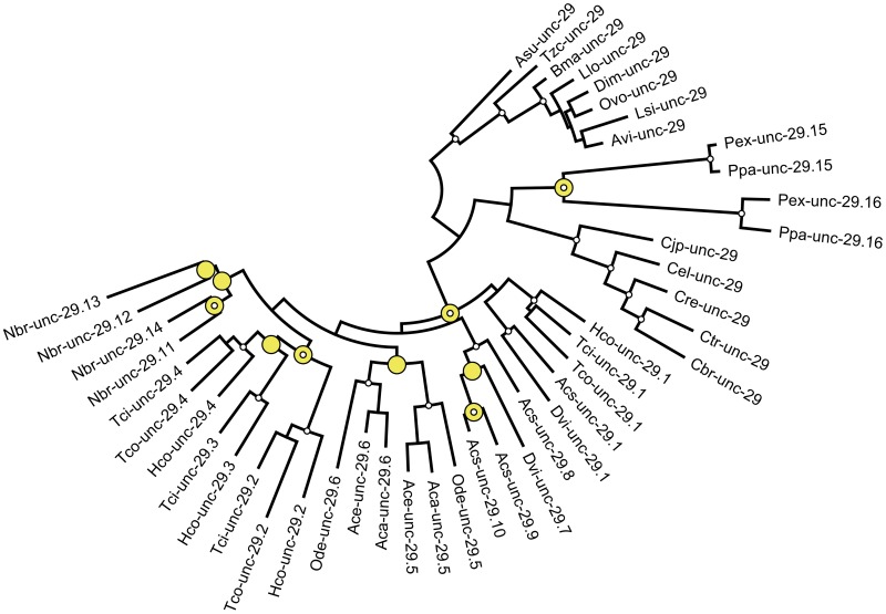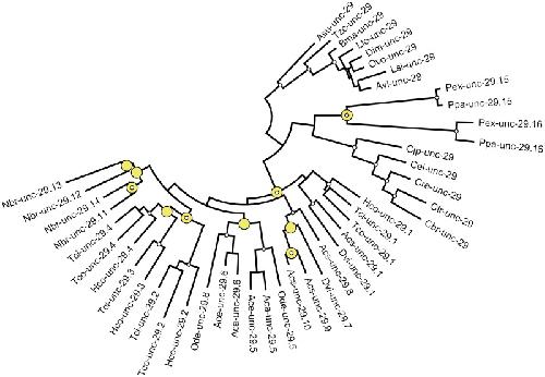 Fig 1. Maximum likelihood phylogeny (PhyML) of unc-29 codon sequence from clade III and clade V nematodes.Standard nomenclature indicates the species. Asu: A. suum, Tzc: T. callipaeda, Bma: B. malayi, Llo: L. loa, Dim: D. immitis, Ovo: O. volvulus, Lsi: L. sigmodontis, Avi: A. viteae, Cjp: C. japonica, Cel: C. elegans, Cre, C. remanei, Ctr, C. tropicalis, Cbr, C. briggsae, Pex: P. exspectatus, Ppa: P. pacificus, Hco: H. contortus, Tci: T. circumcincta, Tco: T. colubriformis, Acs: A. costaricensis, Dvi: D. viviparus, Ode: O. dentatum, Aca: A. caninum, Ace: A. ceylenicum, Nbr: N. brasiliensis. Reliable nodes with SH support of more than 0.9 are indicated by a white circle. Nodes corresponding to inferred duplication events are indicated by a yellow circle. doi:10.1016/j.pt.2010.04.003, 10.1093/sysbio/syq010 |