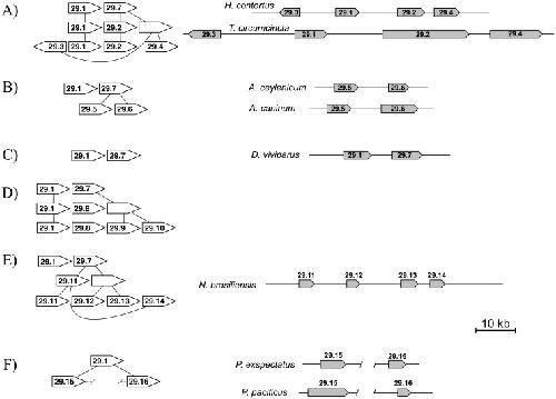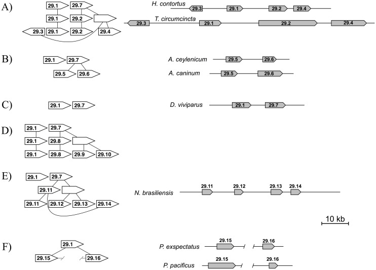 Fig 2. Physical map and conceptual origin for different unc-29 duplication events.Panels A) to F) correspond to different paralogous families. An idealized history for each family is indicated to the left. A physical map for different species is shown to the right, based on genome data from WormBase ParaSite (WBPS2) or the Sanger Center haemonchus_V1 genome build from 2012. Arrows indicate extent of the gene from start to stop codon, where differences in length occur in introns. Direction of transcription is indicated for each gene and maps are drawn to scale, as indicated. |