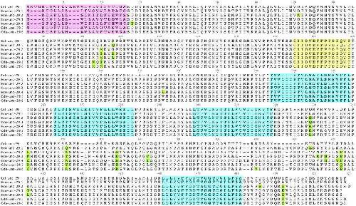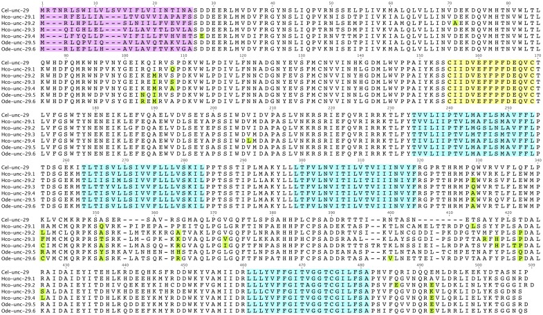 Fig 4. Alignment of UNC-29 protein.Sequence for C. elegans is shown in reference to six representative paralogs from H. contortus and O. dentatum. The signal peptide is indicated in pink, four transmembrane regions in blue and the characteristic cys-loop in yellow. Amino acids under positive selection are indicated in green. |
