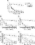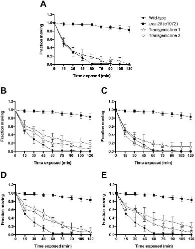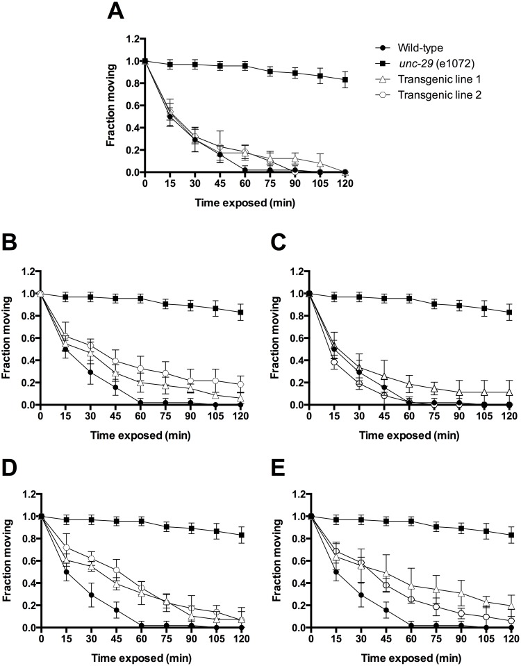 Fig 5. Rescue of LEV sensitivity in transgenic C. elegans.Hco-unc-29 gene copies were transfected into C. elegans unc-29 (e1072) mutant strain (CB1072). The number of moving animals under exposure to 200 μM LEV every 15 min are shown on the Y axes. N2 Bristol wild-type (black circles) and CB1072 unc-29 (e1072) (black squares) controls are shown for comparison. Two independent transfected worm lines (white circles and triangles) were examined for each experiment. This assay was repeated three times on 12 animals per worm line. A) Transfection of Cel-unc-29. B-E) Transfection of unc-29.1, unc-29.2, unc-29.3 and unc-29.4 respectively. Data are plotted as mean ± SD. A Two-way ANOVA with Bonferroni’s multiple comparison post test was performed. In every case, both transfected lines were significantly more LEV sensitive than the CB1072 unc-29 (e1072) mutants (p < 0.001). |