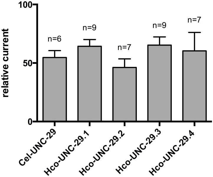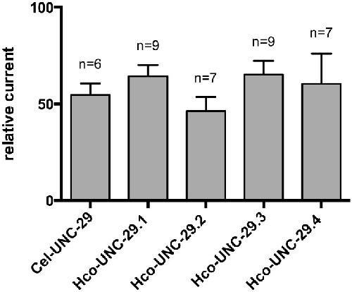 Fig 6. Response of admixture, reconstituted receptors in Xenopus oocytes.Two electrode voltage clamp experiments were performed on oocytes injected with Cel-unc-63, Cel-unc-38, Cel-lev-8, Cel-lev-1 cRNAs and co-expressed with H. contortus accessory proteins, ric-3, unc-50 and unc-74. The addition of cRNAs encoding Cel-unc-29, unc-29.1, unc-29.2, unc-29.3 or unc-29.4 were tested independently. LEV response values were normalized to those elicited after perfusion of 100 μM ACh. Error bars indicate SD. |