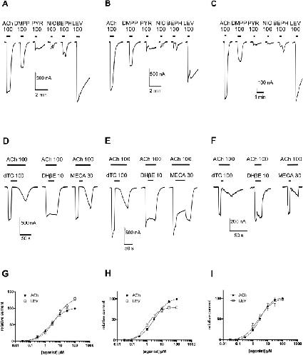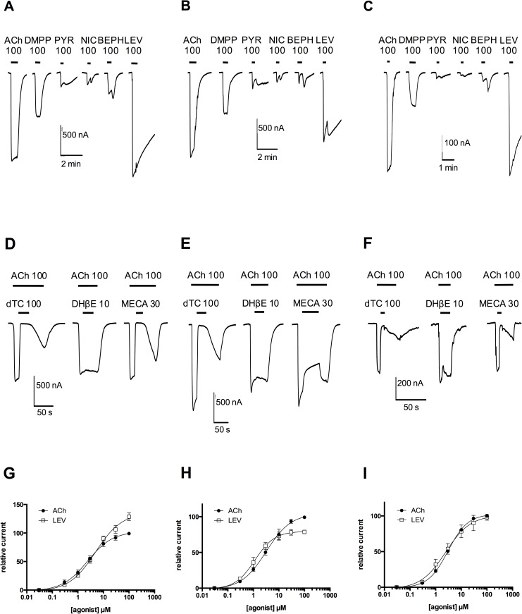 Fig 7. Response of H. contortus reconstituted receptors in Xenopus oocytes.Two electrode voltage clamp experiments were performed on oocytes injected with Hco-unc-63, Hco-unc-38, Hco-acr-8, and Hco-ric-3.1, Hco-unc-74, Hco-unc-50 cRNAs. Hco-unc-29.1, unc-29.3 and unc-29.4 were combined independently with the cRNA mixture. A), B) and C) Representative recording traces from single oocytes perfused with 100 μM of the following cholinergic agonists: acetylcholine (ACh), Dimethylpiperazinium (DMPP), Pyrantel (PYR), Nicotine (NIC), Bephenium (BEPH) and Levamisole (LEV). D), E) and F) Representative recording traces from single oocytes continuously perfused with 100 μM ACh. Oocytes were perfused with the following cholinergic antagonists: D-tubocurarine (dTC, 100 μM), Dihydro-β-erythroidine (DHβE, 10 μM) and Mecamylamine (MECA, 30 μM). Black horizontal bars show the time period of agonist and or antagonist application. G), H) and I) Concentration-response curves for the L-AChR1.1, L-AChR1.3 and L-AChR1.4 for ACh (black circles) and LEV (white squares). All responses are normalized to 100 μM ACh, which corresponds to the saturating dose. The ACh and LEV 50% effective concentration (EC50) values as well as Hill coefficients are indicated in Table 2. Error bars represent SD. |