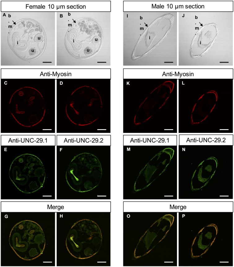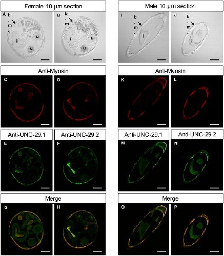 Fig 8. Immunolocalization of UNC-29.1 and UNC-29.2 in adult H. contortus.Adults were fixed and incubated with affinity-purified antibodies raised against UNC-29.1 or UNC-29.2 specific peptides. The localization of both subunits were performed using Alexa 488-labeled secondary antibodies (green). A–H) Confocal microscopy performed on female 10 μm transversal cryosections. A) and B) Transmitted light imaging performed on two separate sections. Letters indicate body muscles (b.m.), uterus (u) and intestine lumen (i). C) and D) Localization of the muscles using primary antibodies raised against myosin protein and stained with secondary, Alexa 594-labeled antibodies (red). E) Staining of UNC-29.1 showing expression in the body muscle as well as the uterus external muscular layer. F) Staining of UNC-29.2 revealing a similar localization to UNC-29.1. G) and H) Merge of green (UNC-29.1 or UNC-29.2) and red (myosin) signals. I–P) Confocal microscopy performed on male 10 μm transversal cryosections. I) and J) Transmitted light imaging performed on two separate sections. K) and L) Localization of the muscles with Alexa 594 secondary antibody (red). M) Staining of UNC-29.1 showing exclusive expression in the body muscles. N) Staining of UNC-29.2 revealing a similar localization. O) and P) Merge of UNC-29 copy (green) and myosin (red) signals. All slices are representative of the middle of the worm body and scale bars correspond to 100μm |