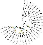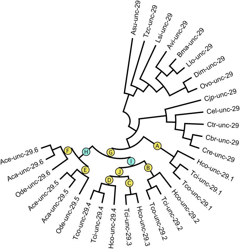 Fig 3. Cladogram of unc-29 copies.This phylogeny was used to develop codon substitution models that produced the data in Table 1. Branches within the Strongyloidea, leading to the different genes are labelled A-J. Branches leading to paralogous copies are labelled yellow, those corresponding to orthologs in different species are labelled blue. See Fig 1 for species names. |