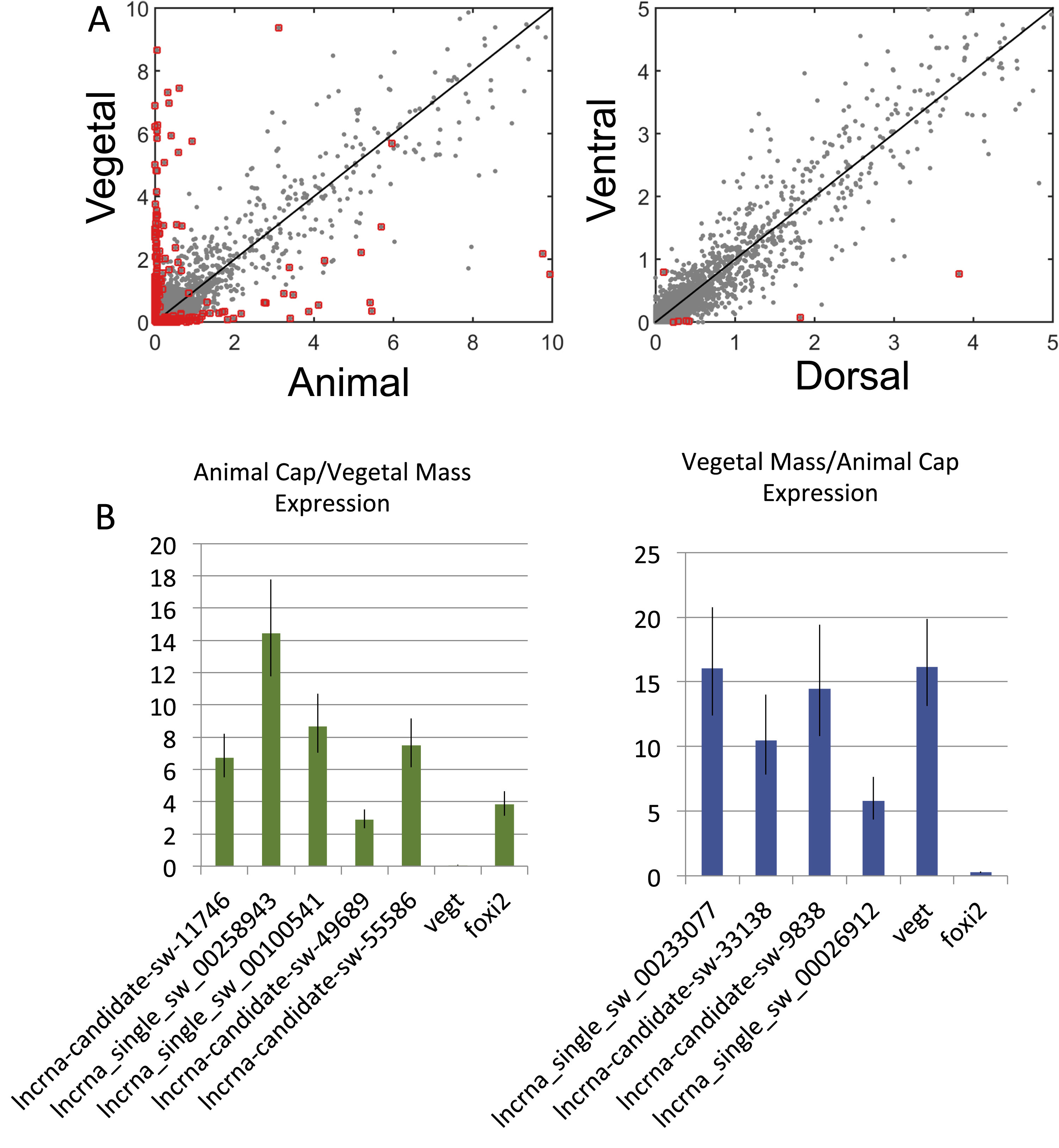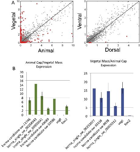 LncRNA distribution in gastrula stage embryos. A) Spatial expression of lncRNAs in gastrula stage embryos. The scatter plot in left panel depicts the comparison between vegetal and animal RPKM values of lncRNAs. The scatter plot in the right panel depicts the comparison between ventral and dorsal expressions. Individual points represent 5689 lncRNAs expressed in gastrula embryos, and the red boxes mark differentially expressed lncRNAs. The black line denotes equal expression between vegetal and animal, or dorsal and ventral tissue fragements. B) RT-qPCR analysis of lncRNAs using RNA isolated from designated tissue fragements.