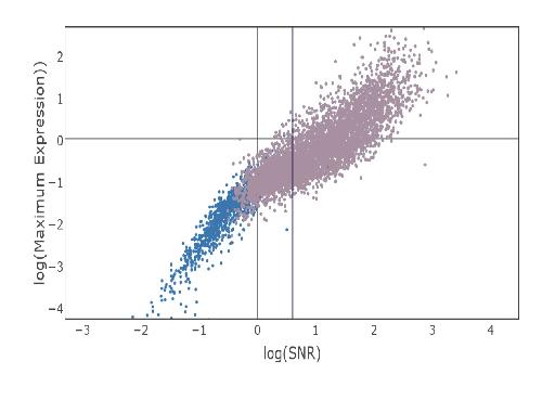 Supplementary Figure 1 Scatter plot of 4640 lncRNA candidates after step 6. X-axis is the log (signal variance/noise variance) calculated using signal variance and noise variance hyperparameters of Gaussian processes. Y-axis is the log of maximum expression value observed for each transcript. The light purple points (2795) have at least 5 consecutive non-zero expression time points and those in blue (1845) failed to satisfy this condition. The vertical line demonstrates log10(SNR)=0.6, which is the threshold we used to eliminate less-qualified transcripts