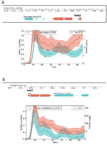 Supplementary Figure 3 Candidate lncRNAs located near foxa2 and sox2 loci. Foxa2 lncRNA did not survive our analysis as one paired end read bridged between this lncRNA and Foxa2 exon. However, we propose that this lncRNA adjacent to FOXA2 is an authentic lncRNA because syntenic lncRNA is found in both human and mouse. We also found lncRNAs adjacent to Sox2 in both human and mouse.