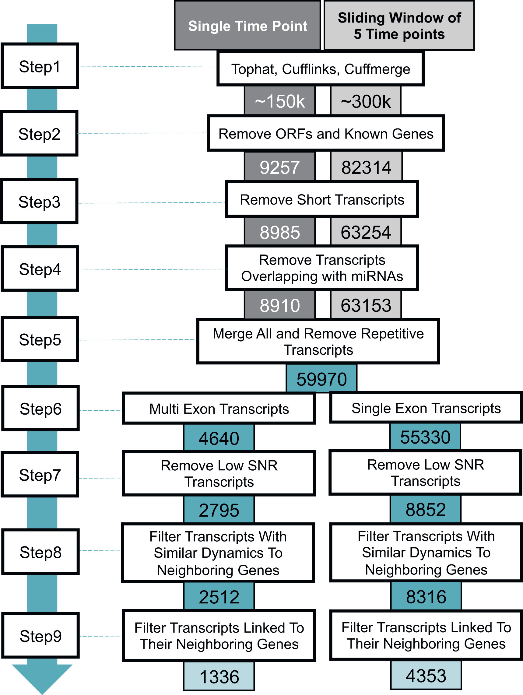 LncRNA discovery pipeline. The output of Cuffmerge (step 1) goes through multiple filtering steps to remove unqualified lncRNA genes and any transcripts with coding potential (step 2), short transcripts (step 3), miRNAs (step 4). These processes are performed in parallel rounds for single time points and also using pooled reads over a sliding window of 5 time points). After these commonly used filtering steps, the remaining transcripts are combined as one set and one representative transcript model is kept among the overlapping transcripts (step 5). Then, multi-exon and single-exon lncRNA candidates are separated (step 6). After removing the lncRNA candidates with less than 5 consecutive time points of non-zero expression, the SNR threshold is applied (step 7). We remove any potential lncRNA candidates that have the possibility of being part of exons of a neighboring gene (step 8 and 9). Our final lists of lncRNAs are 1336 multi-exon lncRNAs and 4353 single-exon lncRNAs.