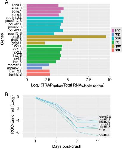 Fig. 6. RGC-enriched factors. (A) Gene families that are highly enriched in naïve TRAP samples compared to total retina include key RGC-specific factors along-side novel groups. (B) When we compare gene expression in crush versus control samples, we see that optic nerve injury leads to strong down-regulation of many of these RGC-enriched genes.
