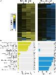 Fig. 5. Functional specificity in the set of transcripts that are up- and down-regulated following retinal ganglion crush. (A) Heat maps showing hierarchical clustering of transcripts that are up- (left) and down-regulated (right), identified by k-means clustering, following retinal ganglion crush. (B) The set of Gene Ontology biological process terms that are significantly over represented in each group of transcripts. The evidence for enrichment of each term (log10(p-value)) is plotted for the group of up- (left) and down-regulated genes (right); there is little overlap in significantly enriched terms.