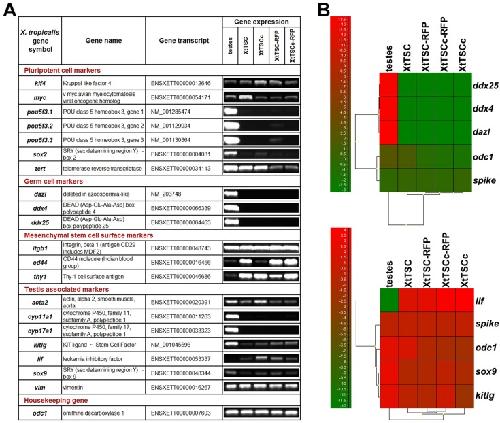 Fig. 2. Expression analysis of X. tropicalis testicular culture. (A) RT-PCR analysis of X. tropicalis testis, XtTSC, XtTSCc, XtTSC-RFP and XtTSCc-RFP. (B) Hierarchical clustering presented as a qPCR heatmaps of germ cell markers and selected testis associated markers. A scale of colours indicates level of expression (the highest expression is shown by bright red, whereas the lowest expression is shown by bright green). Similarity between cell types/genes is indicated by the height at which the dendrograms are joined. The RNA spike represents a highly stable transcript across the cell types and odc1 represents housekeeping gene.