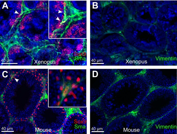Fig. 4. Immunohistochemistry of agarose embedded testicular sections from X. tropicalis and mouse adult males. (A,C) Double staining with Sox9 (red) and Sma (green) antibodies. White arrowheads indicate potential common precursor cells for Sertoli and PTM cell lineages expressing both antigens in X. tropicalis (A) and mouse (C) samples. Insets show a detailed view of structures marked with white arrowheads in underlying figures. (B,D) Staining with vimentin (green) antibody on X. tropicalis (B) and mouse (D) samples. Nuclei were counterstained with DAPI (blue). Scale bars: 40â μm.