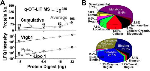 Fig. 4. Identifying and quantifying protein groups in mass-limited specimens.A, Proteins were measured in progressively smaller amounts of digests from whole 16-cell Xenopus embryos using Qq-TOF-MS/MS (top panel). LFQ-based quantification was linear also at the level of proteins (bottom panel), as shown for Vtgb1 (R2 = 0.99), Ppia (R2 = 0.98), and Lipo 1 (R2 = 0.90). Using an orbitrap-quadrupole-linear ion trap (q-OT-LIT) instrument capable of ion trapping, higher-resolution analysis, and parallelization of MS1-MS/MS events, protein identification was enhanced fivefold. Quantified proteins are listed for the Qq-TOF in supplemental Table S1C and q-OT-LIT in supplemental Table S1D. Error bars show S.E.M. B, Gene ontology annotation of biological processes (top panel) and molecular functions (bottom panel) for proteins identified in the 16-cell embryo. |