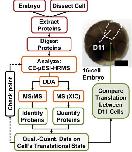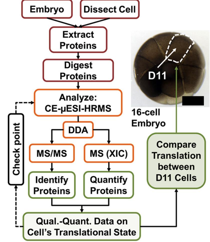Fig. 1. Flowchart for enabling label-free quantification (LFQ) on limited amounts of tissues and single embryonic cells in the 16-cell frog Xenopus laevis embryo. Check-points serve as feed-back mechanism to aid LFQ sensitivity. LFQ was performed to quantify protein expression between n = 3 midline dorsal-animal (D11) blastomeres, which reproducibly give rise to the nervous system (41). Scale bar = 100um. |