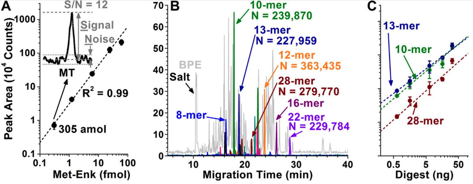 Fig. 2. Trace-level separation and quantification of peptides using CE-μESI-HRMS.A, Quantification was demonstrated across a 3 log-order dynamic range with a ∼75-amol estimated lower limit of detection for Met-Enk. B, The base-peak electropherogram for a 20 ng digest of a 16-cell Xenopus embryo demonstrated complex molecular composition. The extracted-ion currents monitor 9 different peptides (mers) with ± 50-mDa window that were identified from vitellogenin b1 (vtgb1), an abundant, native protein in the embryo (see peptide sequences in supplemental Table S1A. C, Peptide detection was quantitative also in this complex matrix, as exemplified for the vtgb110-mer2+, vtgb113-mer2+, and vtgb128-mer4+ signals. Error bars show S.E.M. in all panels. Parameters of linear regression (intercept/slope/R2): 4.52/1.07/0.99 for Met-Enk; 4.94/0.815/0.98 for vtgb110-mer2+; 5.07/0.730/0.99 for vtgb113-mer2+; and 4.33/0.861/0.96 for vtgb128-mer4+. |