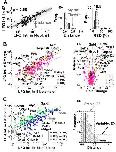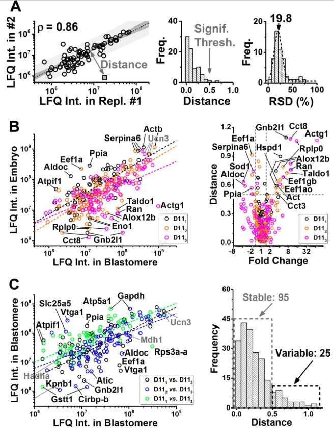 Fig. 5. Correlation analysis for uncovering translational differences between three D11 blastomeres (D111, D112, D113) and the 16-cell embryo. Each data point represents a different protein group. A, LFQ intensities of proteins were reproducibly quantified between technical replicates (D112 shown, left panel), as indicated by high Pearson correlation coefficients (ρ) between the data sets. Prediction band with 95% confidence is shown in gray surrounding the linear fit. For any given protein (see mock protein in gray square), correlation was calculated as the Euclidean distance (d) from the linear fit. Based on the technical reproducibility, a d > 0.5 was considered to mark significant dysregulation in protein abundance (middle panel). LFQ intensities were repeatable with ∼20% relative standard deviation (RSD); therefore, a fold change of ≥1.5 was chosen to mark biological significance (right panel). B, Comparison of protein expression between the D11 cells and the whole 16-cell embryo revealing accumulation for 17 proteins in the cells and eight proteins in the average embryo (left panel). Using correlation distance and median-normalized fold change to query differentially expressed proteins (right panel). C, Correlation analysis also revealed graded translational differences between the D11 blastomeres (left panel). Categorization of protein expresion as stable and variable (see Table II) based on d values (right panel). Key: ρ = 0.72 for D111versus embryo, 0.76 for D112versus embryo, 0.61 for D112versus embryo, 0.61 for D111versus D112, 0.75 for D111versus D113, and 0.73 for D112versus D113. Vitellogenin proteins (LFQ intensity > ∼1 × 109) were excluded from the analysis and are not shown. |