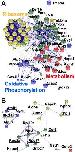 Fig. 6. Protein interaction networks in single D11 blastomeres. Networks were predicted using STRING 10 based on proteins with (A) stable (d <= 0.5) and (B) variable (d > 0.5) abundance between the blastomeres. KEGG functions are labeled for proteins with associations. Among the differentially quantified proteins were many that are known to express in the neural plate, eye, head, nervous tissue, heart, or tail-bud of the embryo (see underlined proteins). An enlarged network is shown for stable proteins in supplemental Fig. S3. STRING parameters: actions view shown; disconnected nodes removed (Atic, Cirbp-p, and Vtga1 in panel B); k-means clustering = 3. |