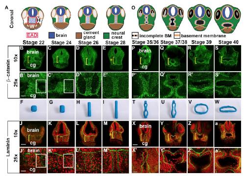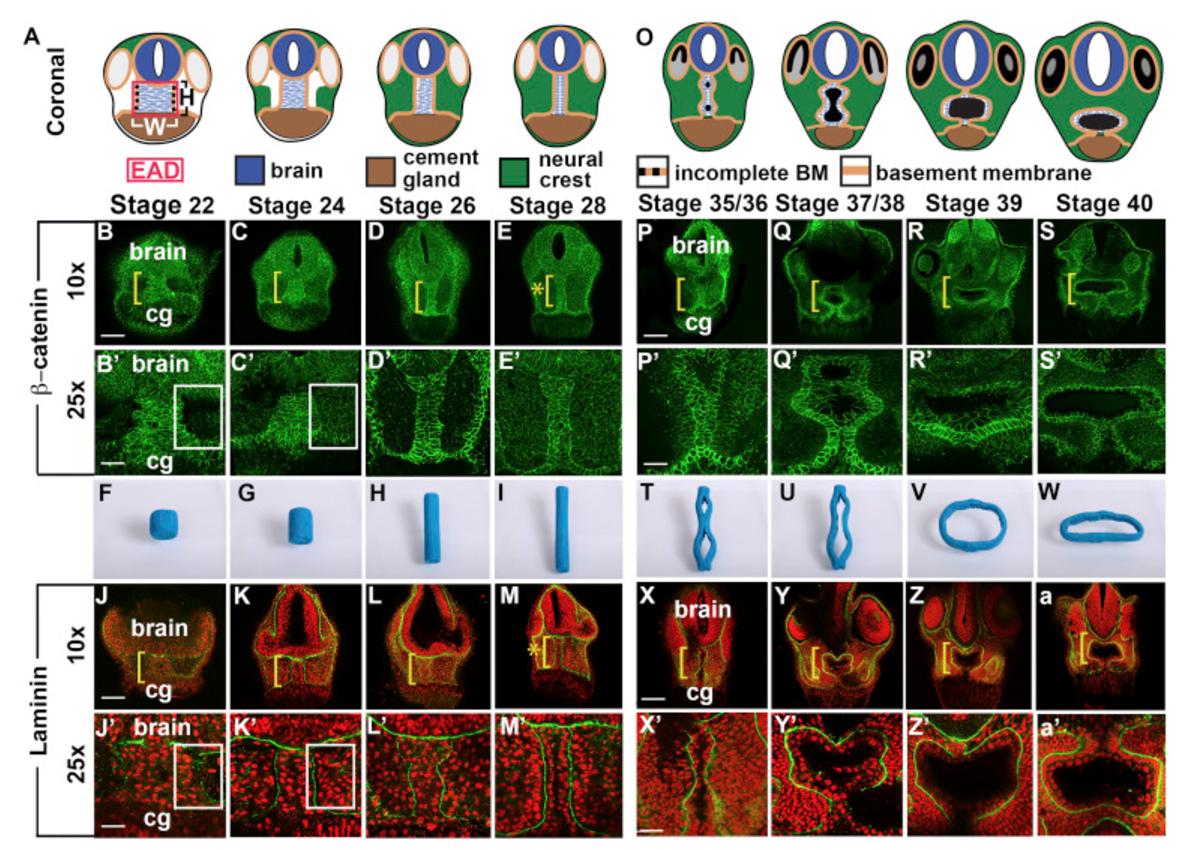 Figure 1. Coronal Anatomy of Xenopus Face and EAD Ectoderm between Late Neurula and Swimming Tadpole (A and O) Schematic, stages 22â28 and 35/36â40. (BâEâ² and PâSâ²) Coronal sections with β-catenin immunolabeling (two independent experiments; stage 22, n = 10; stage 24, n = 11; stage 26, n = 14; stage 28, n = 14). Midline region (bracket) with bright β-catenin labeling is EAD ectoderm of the pre-mouth array. Bracket: region of 10à image (BâE and PâS) enlarged in 25à view (Bâ²âEâ² and Pâ²âSâ²). Asterisk in (E), pre-mouth array at stage 28, enlarged in (Eâ²). cg, cement gland. (FâI and TâW) Still frames from Claymation of mouth opening found in Movie S2. (I) Pre-mouth array stage of Claymation. (JâMâ² and Xâaâ²) Coronal sections with laminin (green) immunolabeling with propidium iodide (PI) nuclear counterstain (red) (two independent experiments; stage 22, n = 10; stage 24, n = 4; stage 26, n = 6; stage 28, n = 7). Bracket: region of 10à image (JâM and Xâa) enlarged in 25à view (Jâ²âMâ² and Xâ²âaâ²). Asterisk (M), pre-mouth array at stage 28, enlarged in (Mâ²). (Bâ², Câ², Jâ², and Kâ²) White boxes surround lateral regions next to EAD, which fill with NC cells between stages 22 (Bâ² and Jâ²) and 24 (Câ² and Kâ²). Scale bars represent 170 μm (10Ã) and 68 μm (25Ã). |
