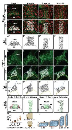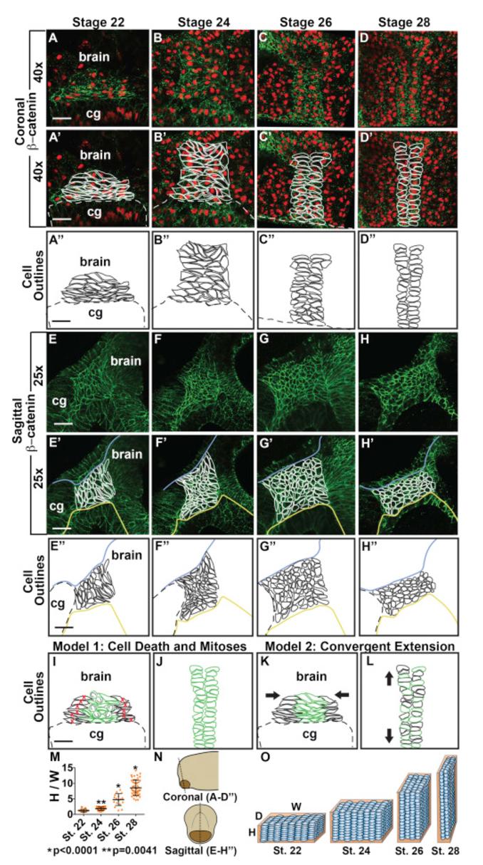 Figure 2. Detailed Anatomy and Modeling of Xenopus EAD Ectoderm between Late Neurula and Swimming Tadpole (AâDâ²) Coronal sections with β-catenin (green) immunolabeling with PI nuclear counterstain (red) from stages 22â28 (two independent experiments; stage 22, n = 10; stage 24, n = 11; stage 26, n = 14; stage 28 n = 14). (EâHâ²) Sagittal sections with β-catenin (green) immunolabeling from stages 22â28 (three independent experiments; stage 22, n = 12; stage 24, n = 10; stage 26, n = 12; stage 28, n = 12). (Aâ²âDâ² and Eâ²âHâ²) Cell membranes traced in white. Blue line separates deep EAD from outer ectoderm. Yellow line separates EAD ectoderm from endoderm. (Aâ²â²âDâ²â² and Eâ²â²âHâ²â²) Cell outlines in black. Dotted line is the top of the cement gland (cg). (DâDâ²â²) Pre-mouth array is present and indicated by cell outlines. Scale bar (25Ã), 68 μm. Scale bars (40Ã), 43 μm. (I and J) Model 1. (I) Stage 22. (J) Stage 28. (K and L) Model 2. (K) Stage 22. (L) Stage 28. (M) Quantification of height versus width of EAD (see Experimental Procedures) (three independent experiments; stage 22, n = 12; stage 24, n = 16; stage 26, n = 17; stage 28, n = 47). p values were obtained from unpaired, two-tailed t tests comparing sequential stages. Error bar represents SD. (N) Diagram demonstrating coronal (AâDâ²) and sagittal (EâHâ²) sections. (O) Diagram showing the change in height (H), width (W), and depth (D) of the EAD ectoderm and its surrounding BM between stages 22 and 28. Blue ovals, EAD ectodermal cells undergoing convergent extension. Orange rectangular prism, laminin BM surrounding EAD ectoderm. |