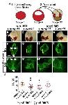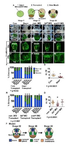 Figure 4. Fzl7 Is Locally Required in the EAD Ectoderm for Convergent Extension Local requirement of Dsh, fzl7, and wnt11 expression tested with an EAD transplant technique. (A) Experimental design: donor LOF tissue was transplanted to uninjected sibling recipients. (BâCâ²) EAD transplant outcome from control or Dep+ RNA donor tissue assayed in three experiments. (B and Bâ²) Control RNA (n = 23). (C and Câ²) Dep+ RNA (n = 22). (Bâ²âCâ²) Overlay of (B) and (C) with GFP fluorescence indicating location of donor transplant in recipient. Dots surround open mouths. Bracket: unopened mouth. Frontal view. cg, cement gland. Scale bar, 200 μm. (DâEâ²) Coronal sections of EAD transplants with control or Dep+ donor tissue assayed in three independent experiments. (D and Dâ²) Control RNA (n = 10); (E and Eâ²) Dep+ RNA (n = 14) with β-catenin immunolabeling. Midline region with bright β-catenin labeling is EAD ectoderm. Bracket: region of 10à image (D and E) enlarged in 25à view (Dâ²âEâ²). (F) Quantification of normal or abnormal structure development depending on background of facial tissue. p values were obtained from Fisherâs exact probability test. (G) Quantification of height over width of EAD (see Experimental Procedures). p values are from unpaired, two-tailed t tests. Error bar represents SD. (HâJ) EAD transplant outcome from control, fzl7, or wnt11 LOF donor tissue assayed in four independent experiments. (H and Hâ²) Control MO (n = 27). (I and Iâ²) fzl7 MO (n = 30). (J and Jâ²) wnt11 MO (n = 30). (Hâ²âJâ²) Overlay of (H)â(J) with GFP fluorescence indicating location of donor transplant in recipient. Dots surround open mouths. Bracket: unopened mouth. Frontal view. Scale bar, 200 μm. (KâMâ²) Coronal sections of EAD transplants with control, fzl7, or wnt11 donor tissue assayed in four independent experiments with β-catenin immunolabeling. (K and Kâ²) Control MO (n = 19). (L and L â²) fzl7 MO (n = 17). (M and Mâ²) wnt11 MO (n = 14). Midline region with bright β-catenin labeling is EAD ectoderm. Bracket: region of 10à image (KâM) enlarged in 25à view (Kâ²âMâ²). (N) Quantification of normal or abnormal structure development depending on LOF background of facial tissue. p values were obtained from Fisherâs exact probability test. (O) Quantification of height over width of EAD midline tissue in transplants. p values are from unpaired, two-tailed t tests. (P) Schematic of model. NC releases Wnt11, which acts on Fzl7 receptors expressed on midline EAD cells. Unless otherwise specified, scale bars represent 170 μm (10Ã) and 68 μm (25Ã). |
