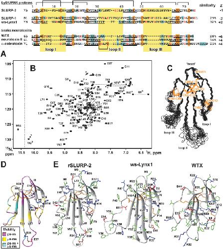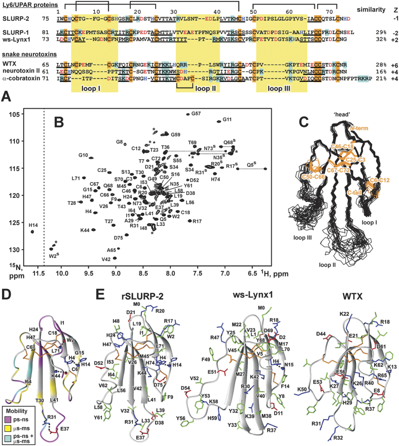 Figure 1. Amino acid sequence alignment and comparison of the spatial structure of SLURP-2 with other human Ly-6/uPAR proteins and three-finger snake neurotoxins.(A) The sequence of the water-soluble domain of human Lynx-1 (ws-Lynx1) is shown without the GPI consensus sequence at the C-terminus. The positively charged (Arg/Lys), negatively charged (Asp/Glu), and His and Cys residues are highlighted. The fragments corresponding to β-strands in the spatial structures of the proteins are underlined. The loop regions are highlighted with a yellow background. (B) The 2D 1H,15N-HSQC spectrum of rSLURP-2 (0.5âmM, 5% dioxane, pH 5.0, 37â°C). The obtained resonance assignments are shown. The resonances of the side-chain groups are indicated by a superscripted âsâ. The signals corresponding to the unfolded/aggregated protein are marked by asterisks. The relative population of this protein form did not exceed 10%. (C) The set of the best 20 rSLURP-2 structures were superimposed over the backbone atoms in regions with a well-defined structure. The three loops and âheadâ of the protein are labeled. Disulfide bonds are shown in orange. (D) Ribbon representation of the spatial structure of rSLURP-2 with mapped dynamic NMR data. 15N relaxation rates were measured at 60âMHz (pH 5.0, 37â°C) for 0.08âmM rSLURP-2 in water without the addition of dioxane (Supplementary Fig. S4). The backbone fragments affected by dynamic processes on the ps-ns time scale (heteronuclear NOEâ<â0.7) or μs-ms time scale (R1â·âR2 productâ>â20âsâ2 or HN signals broadened beyond the detection limit) are highlighted. Additional electrostatic and hydrogen bonding interactions that stabilize the protein fold are shown. Backbone amide and carbonyl groups are indicated by blue and red spheres, respectively. (E) Comparison of the spatial structures of rSLURP-2, ws-Lynx1 and the WTX[P33A] mutant. Aromatic/hydrophobic, positively charged (including His), negatively charged, and Cys residues are indicated in green, blue, red, and orange, respectively. |