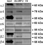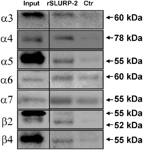 Figure 2. rSLURP-2 binds to different nAChR subunits in human brain extracts.Affinity purification was performed with rSLURP-2 that was covalently coupled to magnetic beads or non-coupled beads (Ctrl) using human temporal cortical homogenates. The samples were subjected to gel electrophoresis and Western blotting along with the homogenate samples used for affinity purification (Input), followed by the detection of nAChR subunits. Representative blot images obtained in one (of two) independent experiment are shown. The representative blot images from the second experiment are shown in Supplementary Fig. S5. The two bands were observed for the β2 subunit. As shown previously, only the lower band corresponded to the β2 subunit55. |