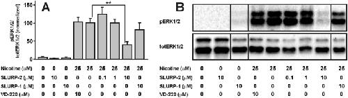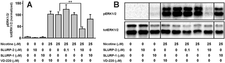 Figure 4. SLURP-2 reduces nicotine-mediated phosphorylation of ERK1/2 in PC12 cells.(A) An increase in ERK1/2 phosphorylation in PC12 cells was elicited by 25âμM nicotine, and this effect was blocked by pre-incubation with 10âμM recombinant SLURP-2. Values are presented as the ratio of phosphorylated (pERK1/2) to total ERK1/2 (totERK1/2) protein and are normalized to the 25âμM nicotine group (nâ=â8, meanâ±âS.E). **indicates a significant difference (pâ<â0.01, ANOVA followed by Dunnettâs multiple comparisons test) compared with the 25âμM nicotine group. (B) Representative images of Western blots summarized in (A). |