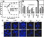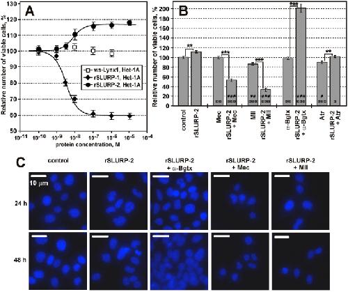 Figure 5. Effects of rSLURP-2 on the growth of Het-1A cells.(A) Influence of rSLURP-2, rSLURP-1, and ws-Lynx1 on Het-1A cell growth (% of control, nâ=â6â12, meanâ±âS.E.). The Hill equation (yâ=âA1(100%-A1)/(1+([protein]/IC50)nH)) was fitted to the data measured using WST-1 reagent. The data for rSLURP-1 were obtained from ref. 24. The calculated EC50, nH and A1 parameters were 7.6â±â1.0ânM, 1.5â±â0.4 and 116â±â1% (rSLURP-2/Het-1A), and 4.3â±â0.6ânM, 1.4â±â0.2 and 60â±â1% (rSLURP-1/Het-1A), respectively. (B) Effects of rSLURP-2 (1âμM), Atr (1âμM), Mec (10âμM), α-Bgtx (1âμM), MII (1âμM) and their co-application on the growth of Het-1A cells after 48âhours. Each bar is the meanâ±âS.E. of four independent experiments performed in triplicate. The pairwise statistical analysis of the data groups measured with and without rSLURP-2 was done using t-test. Data indicated as **(pâ<â0.01) and ***(pâ<â0.001) are significantly different from each other. Multiple comparisons of all the data groups with the âcontrolâ group and with the ârSLURP-2â group were done using ANOVA followed by special Dunnett´s multiple comparisons test. Data marked with ¤ and #(pâ<â0.05), ¤¤ and ##(pâ<â0.01), ¤¤¤ and ###(pâ<â0.001) are significantly different from ârSLURP-2â and the âcontrolâ, respectively. (C) Effects of rSLURP-2 (1âμM) and its co-application with atropine (Atr, 1âμM), Mec (10âμM), α-Bgtx (1âμM), or α-conotoxin MII (MII, 1âμM) on the morphology of Het-1A cell nuclei after 24 and 48âhours. The cells nuclei were colored with Hoechst 33342 and propidium iodide. |