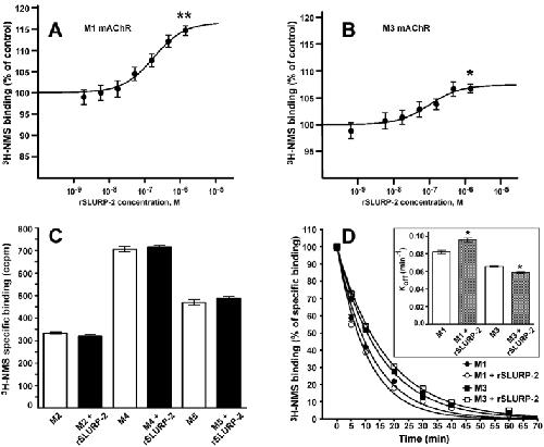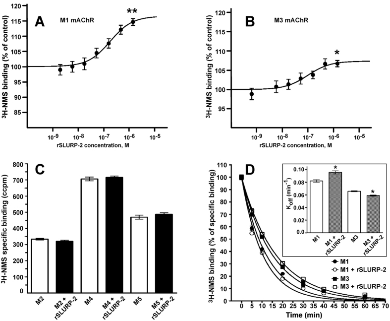 Figure 6. Influence of rSLURP-2 on [3H]-NMS binding to mAChRs.(A,B) Interaction of rSLURP-2 with 3H-NMS binding at M1 and M3 receptors, respectively. Membranes (20 μg of protein) were incubated in the presence of the indicated concentrations of rSLURP-2 and 100 pM 3H-NMS. 3H-NMS binding is expressed as the percent of control binding in the absence of rSLURP-2. Data points are means ± S.E. of four independent experiments performed in quadruplicate. The equation y = 100 * ([NMS]+Kd)/{[NMS]+Kd·(Ka+[rSLURP-2])/(Ka+[rSLURP-2]/α)} was fitted to normalized data. The Kd of 3H-NMS binding (197 and 187 pM for M1 and M3 mAChRs, respectively, see Supplementary Table S2) was determined in parallel saturation experiments. The calculated Ka (equilibrium dissociation constant of rSLURP-2) and α (factor of cooperativity) parameters were 231 ± 81 nM and 1.296 ± 0.051, and 144 ± 56 nM and 1.128 ± 0.013, for the M1 and M3 receptors, respectively. *and **indicate significant differences compared with the control (p < 0.05, p < 0.01, respectively, t-test). (C) Interaction of rSLURP-2 with 3H-NMS binding at M2, M4, and M5 receptors. Membranes expressing 5–20 μg of protein were incubated in the presence of 1.4 μM rSLURP-2 and 150 pM 3H-NMS. Bars represent the mean ± S.E. of specific 3H-NMS binding in two independent experiments performed in quadruplicate. (D) Influence of rSLURP-2 on the dissociation rate of [3H]-NMS at M1 and M3 mAChRs. Time course of [3H]-NMS dissociation in the presence and absence of rSLURP-2 was determined as described in Methods. Specific binding of [3H]-NMS was calculated as the difference between the total and non-specific binding measured in the same experiment and is expressed as the percent of initial binding (ordinate). The exponential decay equation was fitted to the normalized data (% of control binding). The (insert) 4.2 μM rSLURP-2 changed the [3H]-NMS dissociation rate constants (Koff, min−1) from 0.082 ± 0.002 to 0.093 ± 0.002 (n = 4, p < 0.05, t-test) and from 0.066 ± 0.001 to 0.059 ± 0.002 (n = 4, p < 0.05, t-test) at the M1 and M3 receptors, respectively. The dissociation rate constants are presented as the means ± S.E. of the values obtained in four independent experiments performed in triplicate. |