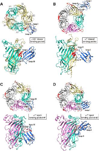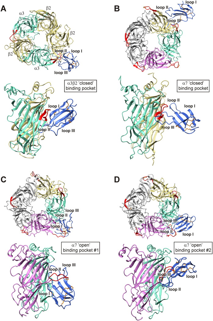 Figure 7. Modeled complexes of rSLURP-2 with α3β2 and α7 nAСhRs.(A,B) rSLURP-2 complexes with ‘closed’ binding sites in the α3β2- and α7-nAСhRs. (C,D) Two solutions of the rSLURP-2 complex with an ‘open’ binding site in α7-nAСhR. Top and side views of the obtained models are shown. The rSLURP-2 molecule is shown in blue, and its disulfide bonds are indicated in orange. The three loops of rSLURP-2 are labeled. For the α3β2 receptor, the α3 subunits are shown in light green, and the β2 subunits are indicated in wheat. For the ‘closed’ binding site of the homopentameric α7 receptor, the principal and complementary subunits are shown in light green and wheat, respectively. For the ‘open’ binding site of the homopentameric α7 receptor, the principal and complementary subunits are indicated in magenta and light green, respectively. Loops C of the α3 and α7 subunits are indicated in red. |