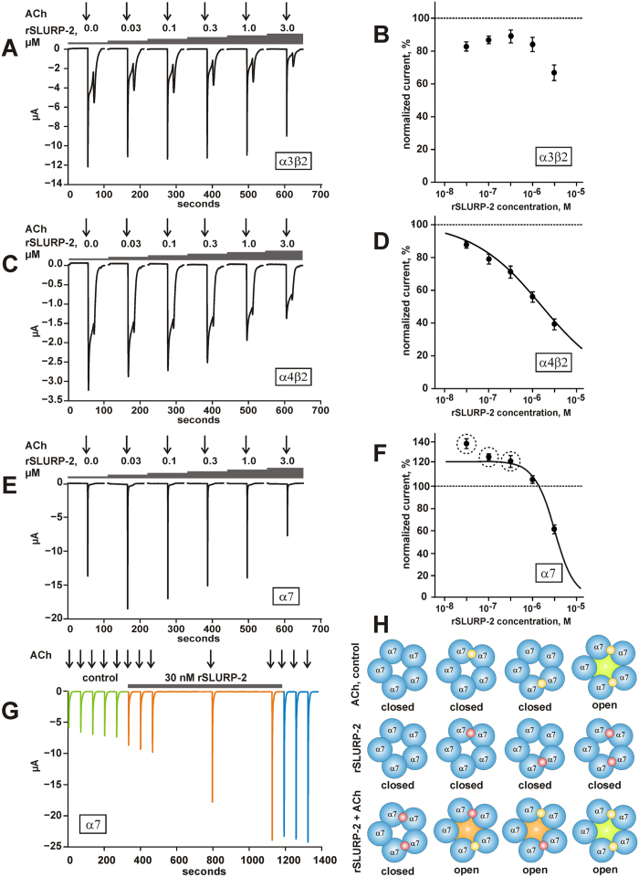 Figure 3. Effect of rSLURP-2 on nAChRs expressed in Xenopus oocytes.(A,C,E) Electrophysiological recordings of currents evoked by 100, 10, and 100 μM of ACh at α3β2, α4β2, and α7 nAChRs, respectively. The concentrations of ACh were similar to the half activation concentrations (EC50) of the corresponding receptor subtypes56. The 5-second pulses of ACh are indicated by the arrows above the traces. The concentration of rSLURP-2 is indicated above the traces. (B,D,F) Dose-response curves of ACh-evoked currents by rSLURP-2 at the α3β2, α4β2, and α7 nAChRs. Each point represents the average ± S.E. of seven, six and seven independent experiments, respectively. The Hill equation (y = A0/(1+([rSLURP-2]/IC50)nH)) was fitted to the normalized data (% of control) obtained at the α4β2 and α7 receptors. For the α4β2 receptor, the value of the scaling parameter (A0) was fixed at 100%. The calculated A0 value for the α7 receptor was 122 ± 3%. The calculated IC50 and nH parameters were 1.7 ± 0.4 μM and 0.54 ± 0.03, and 3.0 ± 0.2 μM and 1.90 ± 0.14, for the α4β2 and α7 receptors, respectively. (G) Electrophysiological recordings of the ACh-evoked current at α7 nAChR in the absence and presence of 30 nM rSLURP-2. Currents were elicited by 5-second pulses of 40 μM ACh. ACh pulses were interrupted by periods of silence. A representative trace from nine independent experiments is shown. Green traces represent the responses evoked by ACh in the absence of the compound, orange traces are the responses evoked by the same ACh test pulse in the presence of rSLURP-2, and blue traces are the responses evoked by ACh after terminating the rSLURP-2 application. (H) Cartoon demonstrating the priming activity of SLURP-2 at α7 nAChRs. ACh and SLURP-2 molecules are indicated as yellow and red spheres, respectively. The open α7 nAChR channels are indicated by green and orange cores. Closed channels have a white core. |