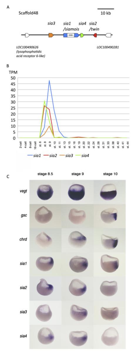 Genomic organization of X. tropicalis siamois-related genes. (A) Genomic clustering of X. tropicalis siamois genes. Genomic mapping of the siamois genes shows clustering in a short interval of scaffold48 (X. tropicalis v.9.0). From the genome assembly, sia1 was predicted to have a longer intron than the other related genes. This region has a sequence gap, which is an uncharacterized nucleotide stretch of an unknown length. Boat-shaped boxes indicate the direction of the coding frame. (B) Transcriptional profiling in early X. tropicalis development based on RNA sequencing data. All siamois-related genes are expressed from blastula to gastrula stages. TPM means transcripts per million. st, stage. (C) Whole mount in situ hybridization analysis for X. tropicalis siamois-related genes, a maternal gene, vegt, a BCNE gene, chrodin (chrd) and an organizer gene, goosecoid (gsc). Typical expression patterns are shown. Fixed embryos were bisected before hybridization. Images of whole embryos are also shown in Supplementary Fig S1.