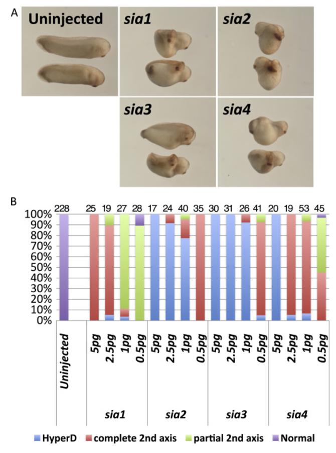 Activity of X. laevis siamois-related genes. Seven X. laevis siamois-related genes (sia1. L, sia2. L, sia4. L, sia1p. S, sia2. S, sia3. S, and sia4. S) were over-expressed with total amounts of 0.5, 1, 2.5 and 5 pg mRNA, (100 and 1000 pg for sia1p. S) into ventral-vegetal cells of X. laevis embryos at 4â8-cell stages. (A) Representative embryos injected with 5 pg mRNA of each siamois-related gene. (B) The percentage of embryos in which a secondary axis was observed after injection of mRNAs of siamois-related genes. The number of embryos analyzed is shown above each bar. sia1p. S has no activity. All siamois-related genes in X. laevis except for sia1p. S induced a complete secondary axis.