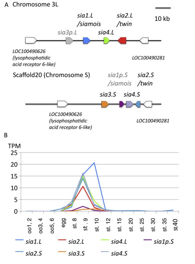 Genomic organization of X. laevis siamois-related genes. (A) Genomic clustering of X. laevis siamois genes and pseudogenes. Genomic mapping of the siamois genes shows clustering in a short interval of chromosome 3 L and 3 S. Synteny of siamois genes is conserved among the X. tropicalis genome, X. laevis chromosome 3 L, and X. laevis chromosome 3 S. Boat-shaped boxes indicate the direction of the coding frame. Black indicates a confirmed active gene, and gray indicates a pseudogene. A striped box indicates that gene expression was not confirmed. (B) Transcriptional profiling in early X. laevis development based on RNA sequencing data. Seven siamois-related genes are expressed from blastula to gastrula stages. TPM means transcripts per million. oo, oocyte; st, stage.