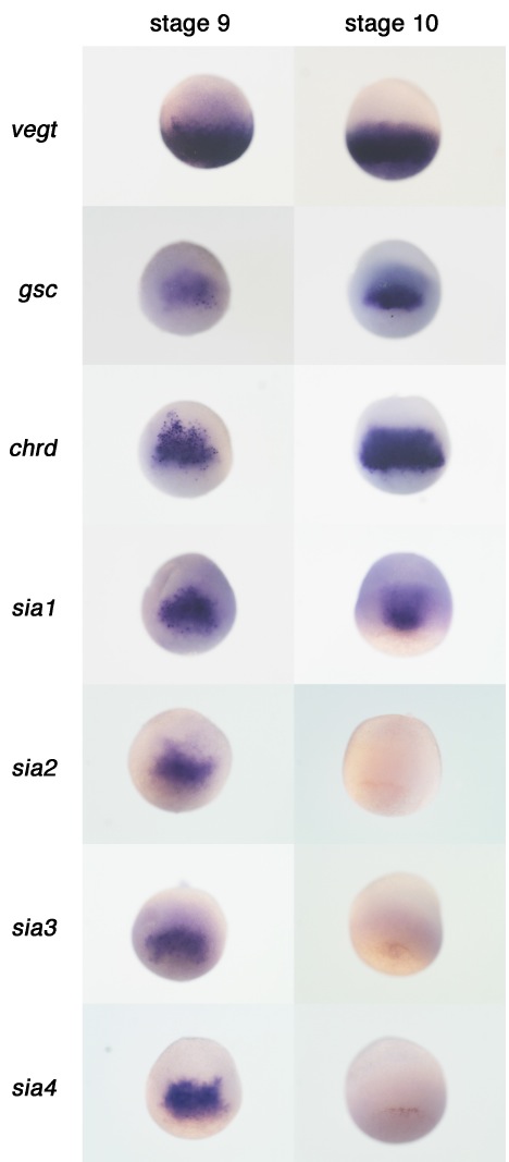 Suppl. Figure S1. Whole mount in situ hybridization of siamois-related genes in X. tropicalis. A maternal gene, vegt, a BCNE gene, chrodin (chrd), and an organizer gene, goosecoid (gsc) were also shown in the panel. The typical expression patterns at blastula (stage 9) and gastrula (stage 10) are shown.