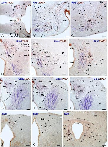 Figure 9. Various genoarchitectural details in sections of the pretectal region of Xenopus laevis at the end of the metamorphic climax (st 64-66) showing ISH for different markers (in blue) and IHC for PAX7 (in brown). The markers shown are indicated in appropriate color code in each panel. Rostral is oriented to the left in horizontal sections (A-C) and dorsal is oriented upwards in oblique-transverse sections (D-L). The approximate level of each section is indicated in A and D. A-F: Xiro1 ISH combined with PAX7 IHC in a series of horizontal sections (A-C) and transverse sections (D-F) showing the intense Xiro1 expression in dorsomedial and ventromedial portions of the APt nucleus, and the less intense expression the lateral portions. Note some Xiro1 expressing cells in the medial IJc nucleus (C,E,F). G-I: Gbx2 ISH combined with PAX7 IHC in a series of transverse sections showing the intense Gbx2 expression in p2 that helps the identification the boundary with the pretectum. Comparing with the PAX7 domain, the APt nucleus is delimited by the lack of both PAX7and Gbx2. Notice also weakly labeled cells in medial portions of the APt nucleus and the dorsal portion of the ISc nucleus. JL: A series of transverse sections showing the Ebf1 expression in the dorsomedial, ventromedial and the ventrolateral portions of the APt nucleus. Note that some cells also expressed Ebf1 in the VJc nucleus (L). For abbreviations see list. Scale bars = 200 μm (A), 100 μm (B-L). |