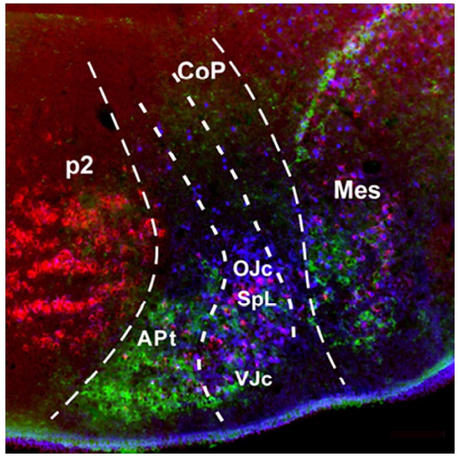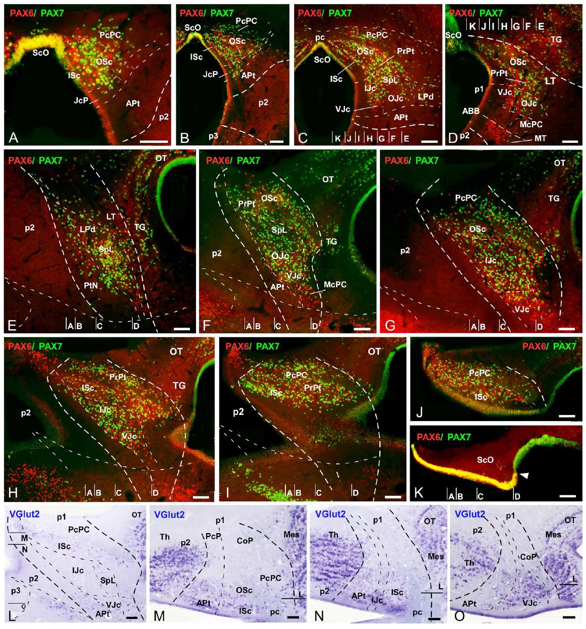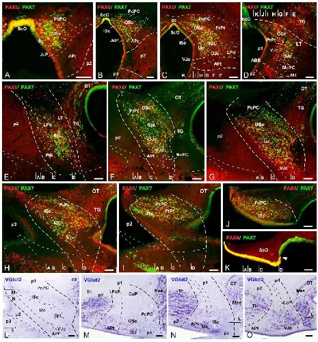 Figure 11. Various genoarchitectural details in sections of the pretectal region of Xenopus laevis at the end of the metamorphic climax (st64-66) showing the combined patterns of PAX6 (in red) and PAX7 (green) (A-K), and ISH for VGlut2 (in blue (L-O). The markers shown in each panel are indicated in appropriate color code in the upper left corner. Dorsal is oriented upwards in oblique-transverse sections (A-D). Rostral is oriented to the left in sagittal sections (E-L) and horizontal (M-O) sections. In panels C-f and H-O the levels of sections shown in other panels are indicated by bars. Throughout the rostrocaudal extent of the pretectum, PAX6 cells are intensely labeled in the medial and caudal portions of the OSc nucleus, the LT and the magnocellular nucleus of the posterior commissure (McPC). PAX6 cells extend in the ventromedial portion of the Jc nucleus and very scarce in lateral portions. PAX7 is more intense in the OSc and along the lateral parts of the JcP (A-F). The ventricular PAX6 labeling reaches the APt domain, but is more intense in the JcP and CoP (A-D), and ends caudally at the DMB (K). PAX7 ventricular expression is restricted to the CoP (A-C, K). L-O: VGlut2 ISH in a sagittal (L) view (level indicated in M-O) and a series of horizontal sections (M-O) showing the intense expression in the ISc and OSc nuclei of the dorsal CoP domain. Distinct VGlut2 expression is present in the periventricular layer of the medial portion of the APt nucleus (M). For abbreviations see list. A magenta-green version of this figure is provided as Supporting Information Figure 7. Scale bars =100 μm. |