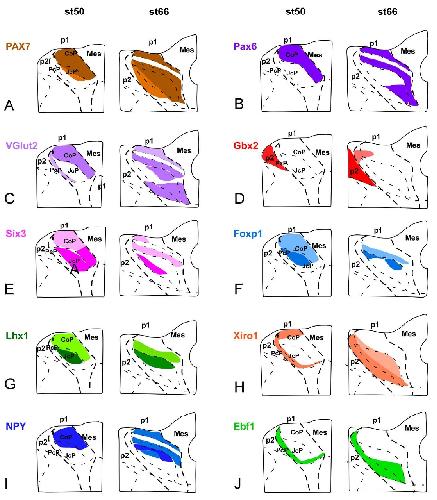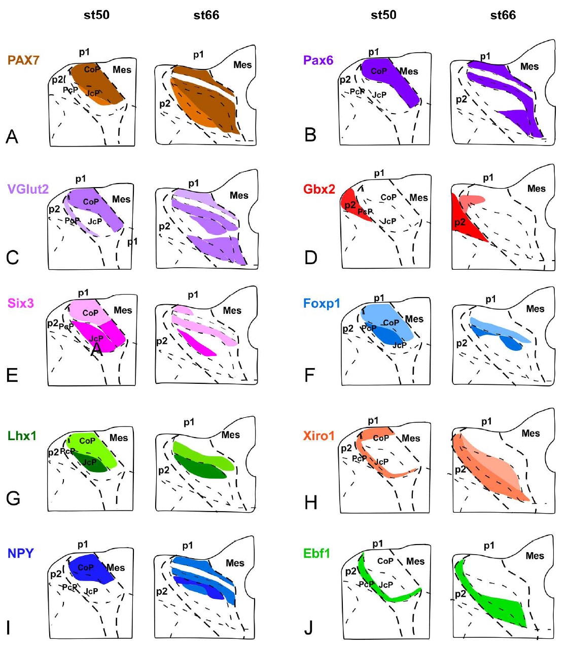 Figure 13. Schematic drawings showing the general expression patterns of the gene markers used to regionalize the pretectal region. The markers are indicated in a color code in the upper left corner of each panel (A-J). In each scheme the expression domain of a gene is represented only within the pretectum at premetamorphic stages (st50) and at the end of the metamorphosis (st66). Rostral is oriented to the left and dorsal is up. |