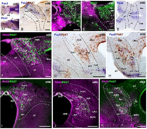 Supplementary Figure 1. Set of photomicrographs illustrating the main markers for the CoP domain and its derivatives, as well as the rostral and caudal boundaries of the pretectum. In each panel the larval stage is indicated in the upper right corner. In situ hybridization (ISH) for Pax3, Pax6 and Gbx2 (in blue for bright field or magenta in the case of fluorescent images) and immunohistochemistry (IHC) for Pax6 and Pax7 or Nkx2.2 (in brown for bright field or green/magenta for fluorescent images) are shown. The markers and the color code are indicated in the upper left corner. Rostral is oriented to the left in all sagittal (B,D,F-H,K) and horizontal (C,E) views. Dorsal is oriented upwards in cross sections (I,J). In panels C, D and K the levels of sections shown in other panels are indicated by bars. A, A1: Pax3 ISH in whole mount brain, in dorsal and lateral view respectively, B: Sagittal section showing the ventricular and periventricular expression of Pax3 that delimitate the rostral thalamo-pretectal boundary (TPB). C, D : Gbx2 (ISH) in combination with PAX7 (IHC) showing the thalamo-pretectal boundary (TPB) defined by Gbx2 in the thalamus and the Gbx2 /PAX7 negative PcP domain. E: Horizontal sections showing the caudal diencephalomesencephalic boundary (DMB) revealed by Pax6 ISH . F: Sagittal section of the pretectal region at advanced prometamorphosis showing PAX6 and PAX7 immunoreactive cells. PAX6 labeling marks the caudal DMB and the combination with PAX7 shows that PAX6 positive cells are in the CoP domain at this stage. Note the scarce PAX6 cells in the PcP domain. G, H: Sagittal sections of advanced prometamorphic larvae through the superficial (G) and intermediate (H) strata showing the codistribution of Pax6 and PAX7 labeled cells. Pax6 is present mainly in the CoL and the ventral part of JcL at this stage. PAX7 positive cells are abundant in the intermediate strata in the CoP and JcP with only some cells in the PcP (black arrow H). I-K: Various genoarchitectural details in sections through the CoP and JcP pretectal regions at the end of the metamorphic climax. PAX6 cells are abundant in the ISc and OSc regions, the parvocellular nucleus of the posterior commissure (PcPC), and the magnocellular nucleus of the posterior commissure (McPC). PAX6 cells extend primarly in the ventromedial portion of the Jc nucleus. PAX7 cells are found in the OSc and ISc, and along the lateral parts of Jc nucleus. The ventricular PAX6 cells reach the APt domain, but are more intensely labeled in the JcP and CoP, whereas PAX7 ventricular labeling is restricted to the CoP (I, J). For abbreviations see list. Scale bars = 200 μm (A, A1, G-K); 100 μm (B-F). This figure corresponds to the Figure 2. |