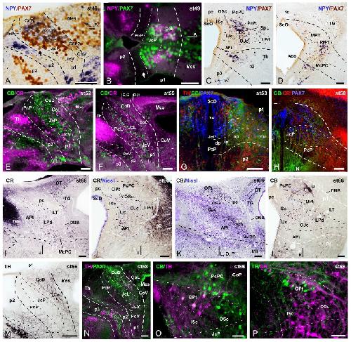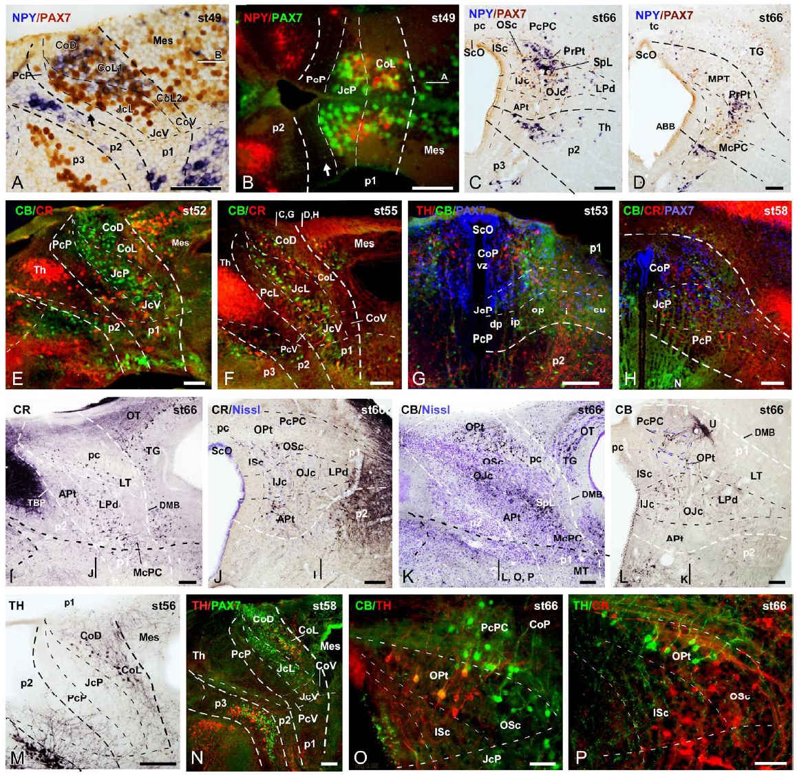 Figure 5. Set of photomicrographs illustrating the main complementary markers used to characterize further the PcP, JcP and CoP derivatives of the pretectum. In each panel the larval stage is indicated in the upper right corner. In situ hybridization (ISH) for NPY (in blue for bright field or red in the case of fluorescent images) and immunohistochemistry (IHC) for PAX7, CB, CR, and TH (in brown for bright field or green/red/blue for fluorescent images) are shown. Some sections were also Nissl counterstained. The markers and the color code are indicated in the upper left corner. Rostral is oriented to the left in all sagittal (A, E, F, I, K, M, N) or horizontal (B) views. Dorsal is oriented upwards in transverse sections (C, D, G, H, J, L, O, P). In panels A, B, F, I-L the levels of sections shown in other panels are indicated by bars. A, B: NPY ISH and Pax7 IHC at the beginning of the premetamorphosis in sagittal (A) and horizontal (B) sections showing the distribution of NPY in the JcP and CoP. NPY marks the CoD and CoL domains, and the caudal and lateral subdivision of the JcL. C, D: Oblique-transverse sections at metamorphic climax stages showing the intense NPY expression in the OSc and weak expression in ISc. In the JcP derivatives, distinct NPY expression is shown in the SpL (larger cells) and the OJc (smaller cells intermingled with PAX7 positive cells). E, F: CB/CR IHC in sagittal sections at premetamorphic (E) and prometamorphic (F) stages showing CB staining in the rostral part of CoD and dorsally in CoL . CB is abundant in the rostral part of the intermediate stratum of the JcP. CB cells are codistributed with CR cells along CoL and JcL. CR is present in cells of the ventral half of the PcL and PcV. G: Transverse section at premetamorphic stages showing a distinct TH positive population within the dorsal portion of CoP, characterized by CB and Pax7 immunoreactive cell population. H: Transverse section at prometamorphic stages showing the codistribution of CBir and CRir cell populations in the CoP and JcP, characterized by the Pax7 cell population. I-L: Distribution of CR (I, J) and CB (K, L) at metamorphic climax illustrating several specific nuclear and neuropil formations of the pretectum. CR immunoreaction in a sagittal (I) and coronal section (J, level indicated in I) showing the TPB and numerous cells in the APt nucleus, and sparse cells in LPd , OJc and IJc, and numerous cells in the OSc and ISc. CB immunoreaction (K, L) at comparable levels shows abundant CB cells in the PcPC, OSc and IJc. M, N: TH immunoreactivity in the CoD and CoL at prometamorphic stages. O, P: Transverse sections through the CoP at metamorphic climax showing the THir cell population in combination with CB (O) and CR (P) in the OPt nucleus. For abbreviations see list. A magenta-green version of this figure is provided as Supporting Information Figure 3. Scale bars = 50 μm (A, B); 100 μm (C-P). |
