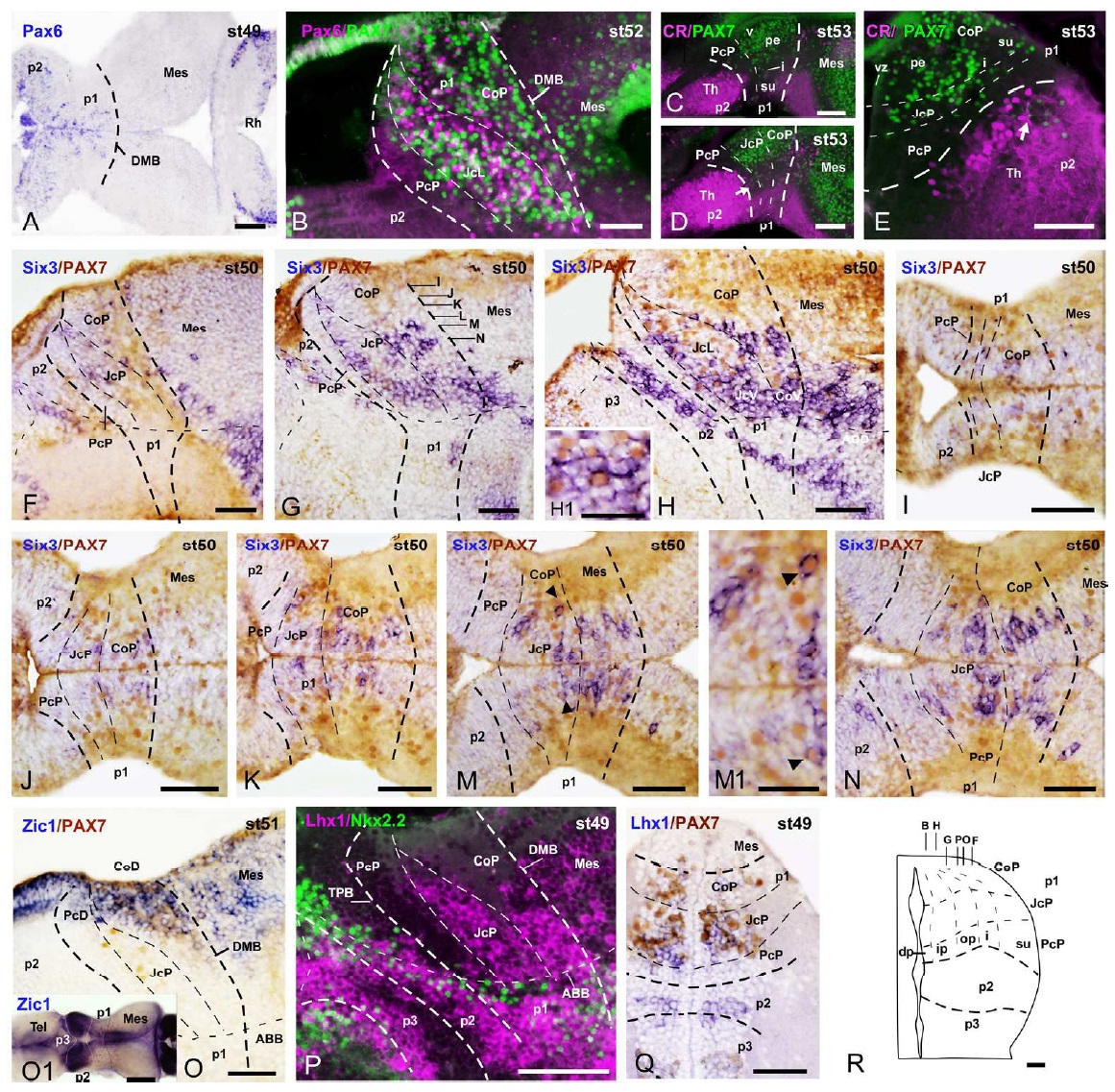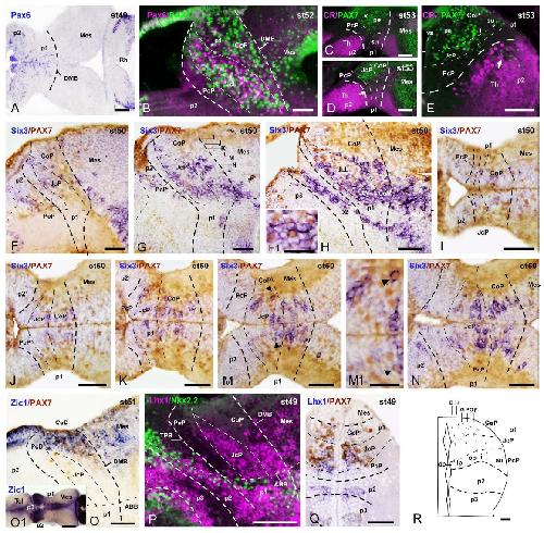 Figure 6. Whole mounts or brain sections of premetamorphic larvae (stages indicated on each photomicrograph) of Xenopus laevis showing in situ hybridization (ISH) for different markers (in blue for bright field or red in the case of fluorescent images) and immunohistochemistry (IHC) for PAX7 or NKX2.2 (in brown for bright field or green for fluorescent images). The markers shown in each panel are indicated in appropriate color code in the upper left corner. Rostral is oriented to the left in sagittal (B, F-H, O, P) or horizontal (A, C, D, I-N, O1) views. Dorsal is oriented upwards in oblique-transverse sections (E, Q, R). In G and R the different levels of the sections is indicated for the corresponding photomicrographs. A: Horizontal section showing Pax6 ISH, which caudally marks the DMB. B: Sagittal section through the pretectal region showing that the Pax6 signal marks the DMB and the combination with PAX7 helps the localization of the Pax6 cells in the CoP and distinct subdomains of the JcP. C-E: Horizontal (C, D) and transverse (E) sections showing CR and PAX7 IHC. CR marks the TPB and PAX7 marks the CoP and JcP, showing the PcP domain devoid of labeling. F-H: Sagittal sections stained for Six3 ISH that marks intensely the JcP domain and the ventral subdivision of the CoP (CoV) and less intensely the lateral (CoL) and dorsal (CoD) subdivisions. PAX7 IHC reveals PAX7 cells in the JcP within the Six3 domain. I-N: Dorsoventrally arranged horizontal sections through the pretectal region at the levels indicated in P and Q, showing the distribution of Six3 ISH combined with PAX7 IHC. Note that the PcP is devoid of both markers and the JcP is characterized by the presence of intense Six3 expression; some cells expressing Six3 are located in the CoP. H1, M1: Higher magnifications of the JcP in H and M, respectively, illustrating some double labeled cells (arrowheads). O1: Dorsal overview of a wholemount brain stained for Zic1 ISH. O: Sagittal section showing intense Zic1 expression in the dorsal division of the PcP, JcP and CoP. P: sagittal section showing Lhx1 expression in the JcP in combination with NKX2.2 IHC that marks the ABB. Lhx1 expression reaches the NKX2.2 positive band ventral to the JcP and CoP. Q: Cross section showing the Lhx1 expression, in relation to PAX7, in the JcP. R: Schematic representation of the pretectal region of premetamorphic larvae and the radial subdivisions. Levels of sagittal sections are also indicated. For abbreviations see list. A magenta-green version of this figure is provided as Supporting Information Figure 4. Scale bars = 100 μm (A-E, R), 50 μm (F-Q), 25 μm (H1, M1), 500 μm (O1). |