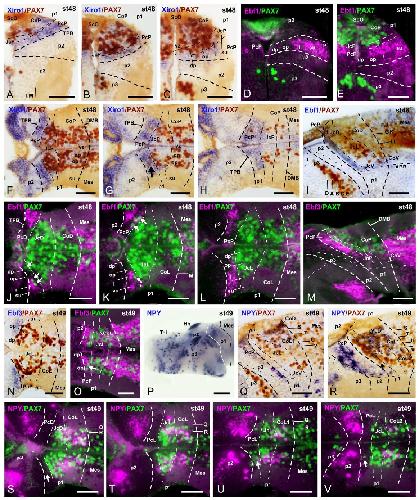 Supplementary Figure 5. Wholemounts and brain sections of premetamorphic larvae (stages indicated on each photomicrograph) of Xenopus laevis showing in situ hybridization (ISH) for different markers (in blue for bright field or magenta in the case of fluorescent images) and immunohistochemistry (IHC) for PAX7 (in brown for bright field or green for fluorescent images). The markers shown in each panel are indicated in appropriate color code in the upper left corner. Rostral is oriented to the left in sagittal (I, M, P-R) or horizontal (F-H, J-L, N, O, S-V) views. Dorsal is oriented upwards in oblique-transverse sections (A-E). In A, I , K, Q -U the different levels of the sections is indicated for the corresponding photomicrographs. A-C: Transverse sections through the pretectal region showing the rostrocaudal distribution of Xiro1 combined with PAX7 IHC. Note the PcP intensely marked for Xiro1 in all radial strata. D, E: Transverse sections through the pretectal region (levels indicated in I) showing the rostral (D) and caudal (E) distribution of Ebf1 ISH combined with PAX7 IHC. The PcP domain is intensely marked for Ebf1 in the intermediate and superficial strata. F-H: Horizontal sections through the pretectal region (levels indicated in I) showing the dorsoventral distribution of Xiro1combined with PAX7 IHC. Xiro1 expression serves to assess the shape of the PcP. I: Sagittal section that shows the intense Ebf1 expression in the PcP domain, which lacks PAX7 cells. J-L: Horizontal sections through the pretectal region (levels indicated in I) showing the distinct Ebf1 expression in the PcP domain, free of PAX7 cells. Ebf1 is useful for the identification of the rostral TPB. Notice the PAX7 positive cells into the PcP domain (arrows in J, K). M: Sagittal section showing the intense Ebf3 expression in the PcP domain, similar to Ebf1 (compare with I). N, O: Horizontal sections showing that the pattern observed for Ebf1 is similar for Ebf3. P: Lateral overview of a wholemount brain stained for NPY ISH. Q, R: Sagittal sections showing the lateromedial distribution of NPY in the JcP and CoP domains. NPY marked the CoD, CoL subdomains in the CoP and the lateral JcL subdomain in the JcP. S-V: Horizontal sections of the pretectal region showing the dorsoventral differential distribution of NPY in the JcP and CoP domains (shown in Q and R). For abbreviations see list. Scale bars = 100 μm (P), 50 μm (A-O, Q-V). This figure corresponds to the Figure 7. |